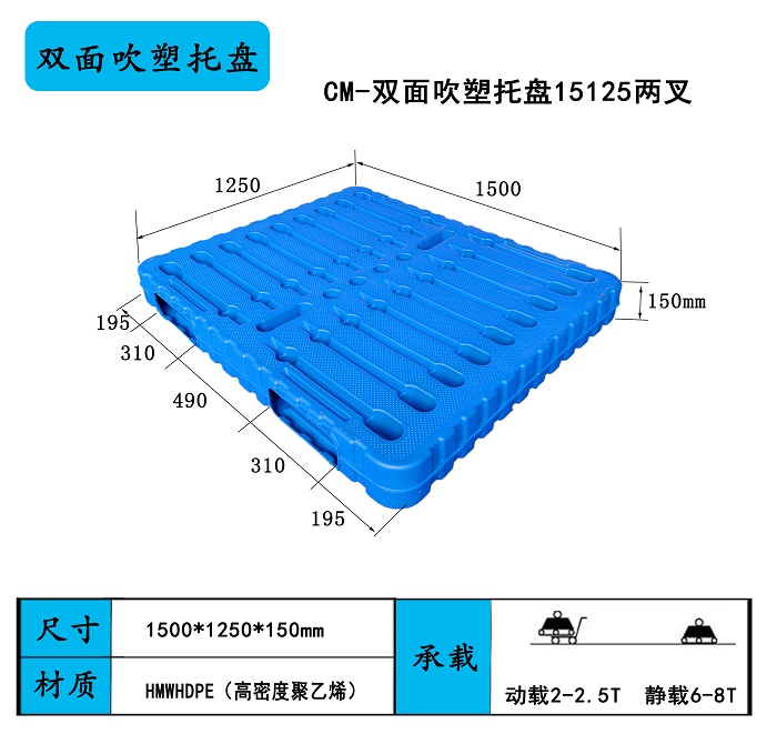 中空吹塑塑料托盤的生產(chǎn)與一般的中空制品吹塑成型方法相類似,因其產(chǎn)品較大,且為雙面型,需要較大的擠出機(jī)、合模機(jī)及模具等。目前國(guó)內(nèi)中空成型機(jī)制造廠家已經(jīng)研發(fā)出專業(yè)高速生產(chǎn)高強(qiáng)度吹塑托盤的超大型中空成型機(jī),采用HDPE(低壓高密度聚乙烯)高強(qiáng)度塑料生產(chǎn),成型速度較快,產(chǎn)品質(zhì)量較好,具有高強(qiáng)度、壽命長(zhǎng)的特點(diǎn),一般吹塑托盤的使用壽命可以達(dá)到5~10年,同時(shí)可以在-40~70℃的環(huán)境下穩(wěn)定工作。其產(chǎn)品的動(dòng)載可以達(dá)到3t以上,抗彎強(qiáng)度均是較高的水平。是高強(qiáng)度使用環(huán)境的首選托盤,目前其價(jià)格比注塑托盤偏高一些,但其使用壽命特別長(zhǎng),所以它的性價(jià)比是所有托盤中最高的。吹塑托盤隨著成型設(shè)備價(jià)格的大幅度降低,將會(huì)在近年內(nèi)獲得較快的發(fā)展。將對(duì)于節(jié)約有限的石油資源與物流成本有極大的好處。