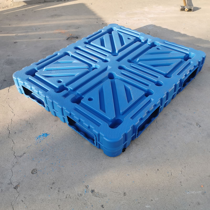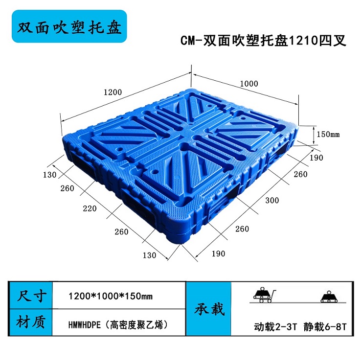 中空吹塑塑料托盤(pán)的生產(chǎn)與一般的中空制品吹塑成型方法相類(lèi)似,因其產(chǎn)品較大,且為雙面型,需要較大的擠出機(jī)、合模機(jī)及模具等。目前國(guó)內(nèi)中空成型機(jī)制造廠(chǎng)家已經(jīng)研發(fā)出專(zhuān)業(yè)高速生產(chǎn)高強(qiáng)度吹塑托盤(pán)的超大型中空成型機(jī),采用HDPE(低壓高密度聚乙烯)高強(qiáng)度塑料生產(chǎn),成型速度較快,產(chǎn)品質(zhì)量較好,具有高強(qiáng)度、壽命長(zhǎng)的特點(diǎn),一般吹塑托盤(pán)的使用壽命可以達(dá)到5~10年,同時(shí)可以在-40~70℃的環(huán)境下穩(wěn)定工作。其產(chǎn)品的動(dòng)載可以達(dá)到3t以上,抗彎強(qiáng)度均是較高的水平。是高強(qiáng)度使用環(huán)境的首選托盤(pán),目前其價(jià)格比注塑托盤(pán)偏高一些,但其使用壽命特別長(zhǎng),所以它的性?xún)r(jià)比是所有托盤(pán)中最高的。吹塑托盤(pán)隨著成型設(shè)備價(jià)格的大幅度降低,將會(huì)在近年內(nèi)獲得較快的發(fā)展。將對(duì)于節(jié)約有限的石油資源與物流成本有極大的好處。